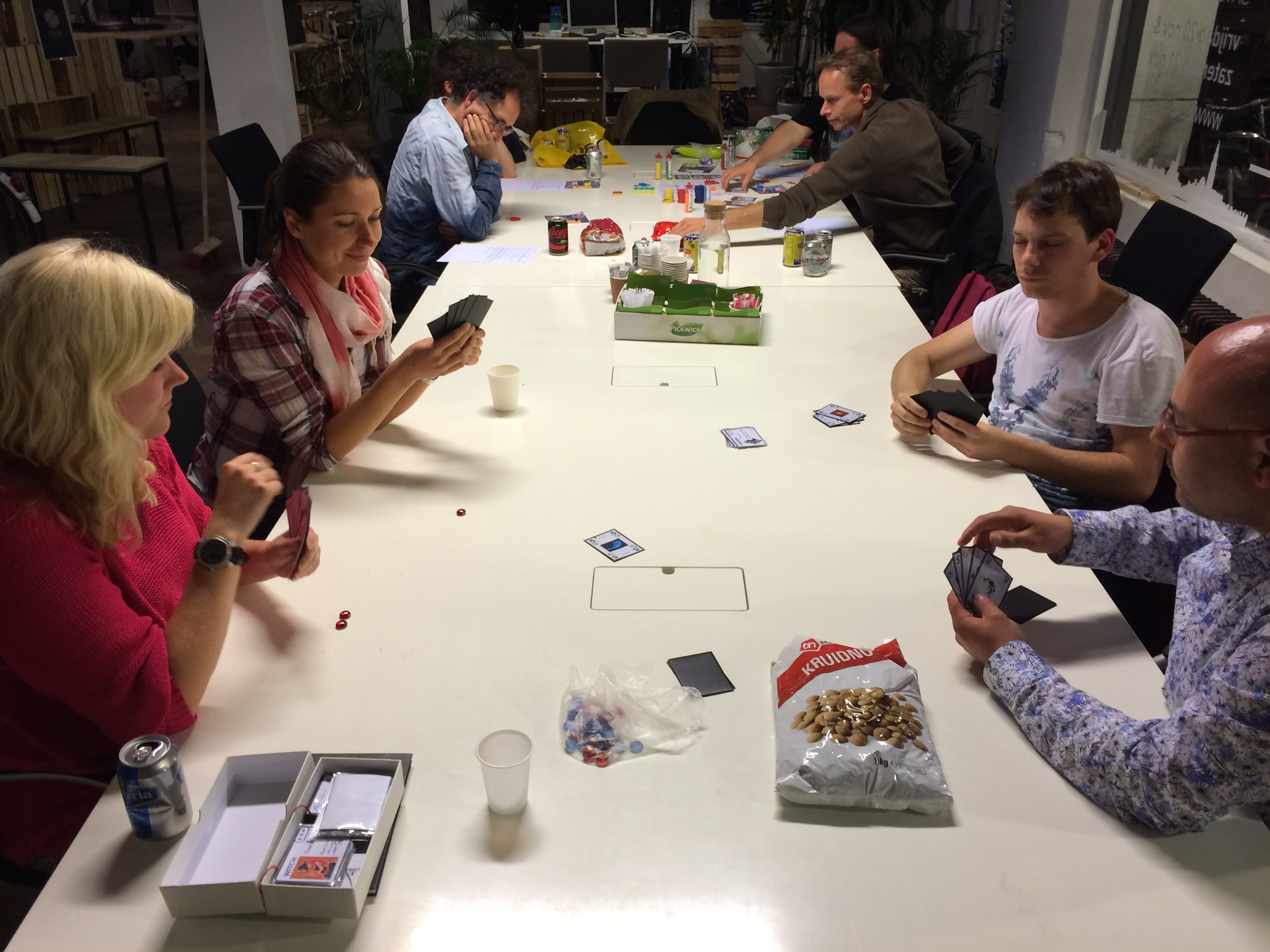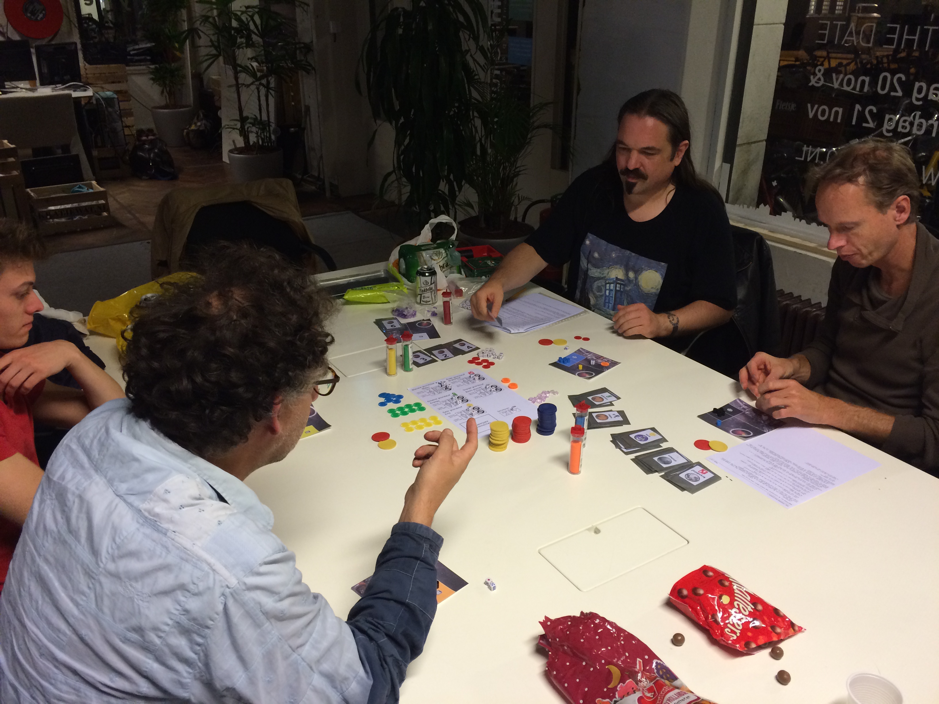 Daarna splitste de groep. Eelco bracht een nieuwe versie van Hypergate ter tafel: een handelsspel met ruimte thema waarbij spelers met elkaar grondstoffen ruilen, maar ook kunnen investeren in het ontwikkelen van technologieën.